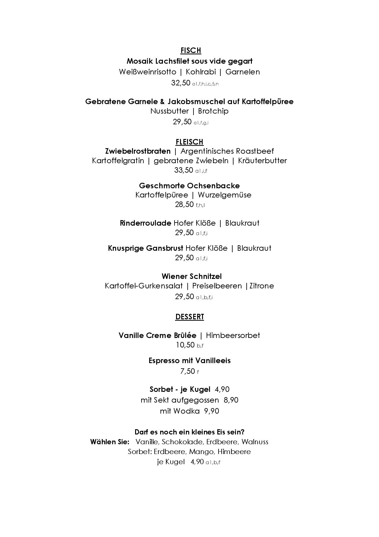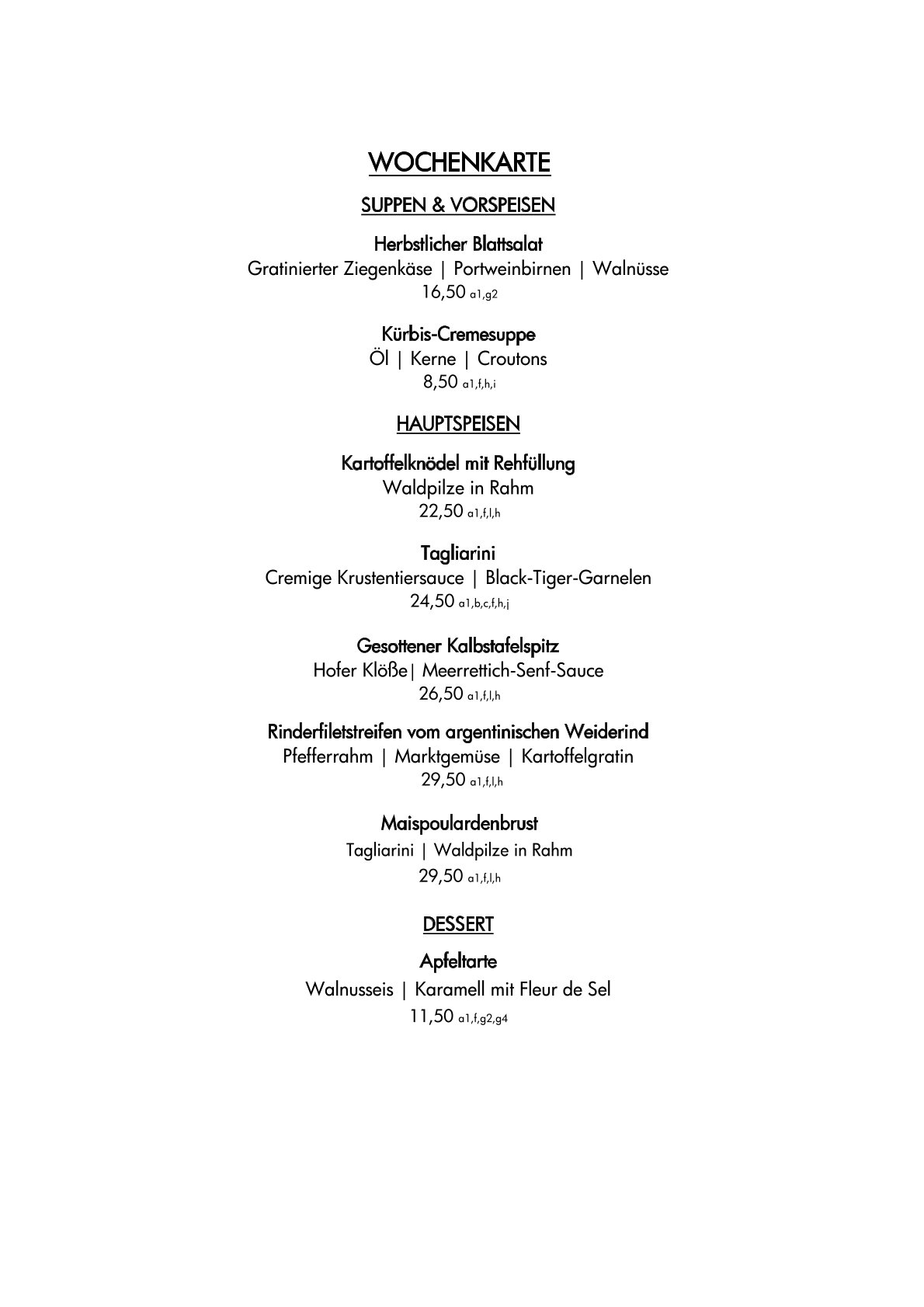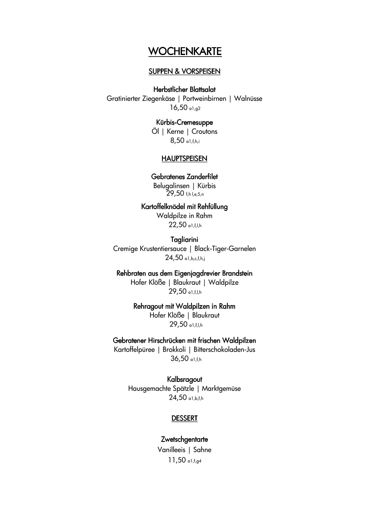 Zusätzlich zur festen Speisekarte, gibt es auch wechselnde Tages- und Wochenkarten. Je nach Saison gibt es ein Angebot an Wildgerichten aus eigener Jagd, Pilzgerichte und natürlich auch vegetarische und vegane Gerichte.